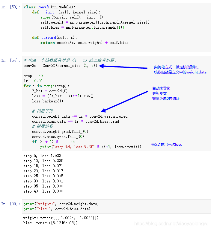 学到的卷积核的权重参数与我们之前定义的核数组K较接近,而偏置参数接近0。自动初始化。无需我们再次初始化。