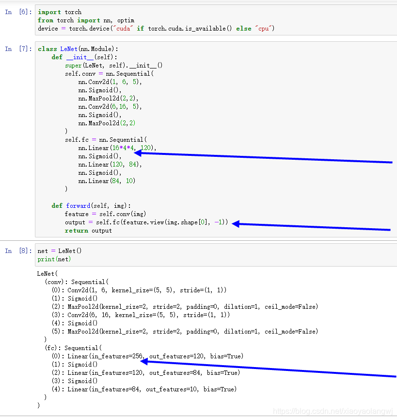 卷积层块的输出形状为(批量大小, 通道, 高, 宽)。当卷积层块的输出传入全连接层块时,全连接层块会将小批量中每个样本变平(flatten)。也就是说,全连接层的输入形状将变成二维,其中第一维是小批量中的样本,第二维是每个样本变平后的向量表示,且向量长度为通道、高和宽的乘积。全连接层块含3个全连接层。它们的输出个数分别是120、84和10,其中10为输出的类别个数。