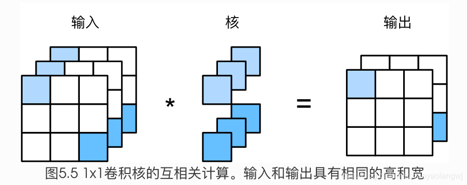 假设我们将通道维当作特征维,将高和宽维度上的元素当成数据样本,那么1 × 1卷积层的作用与全连接层等价。