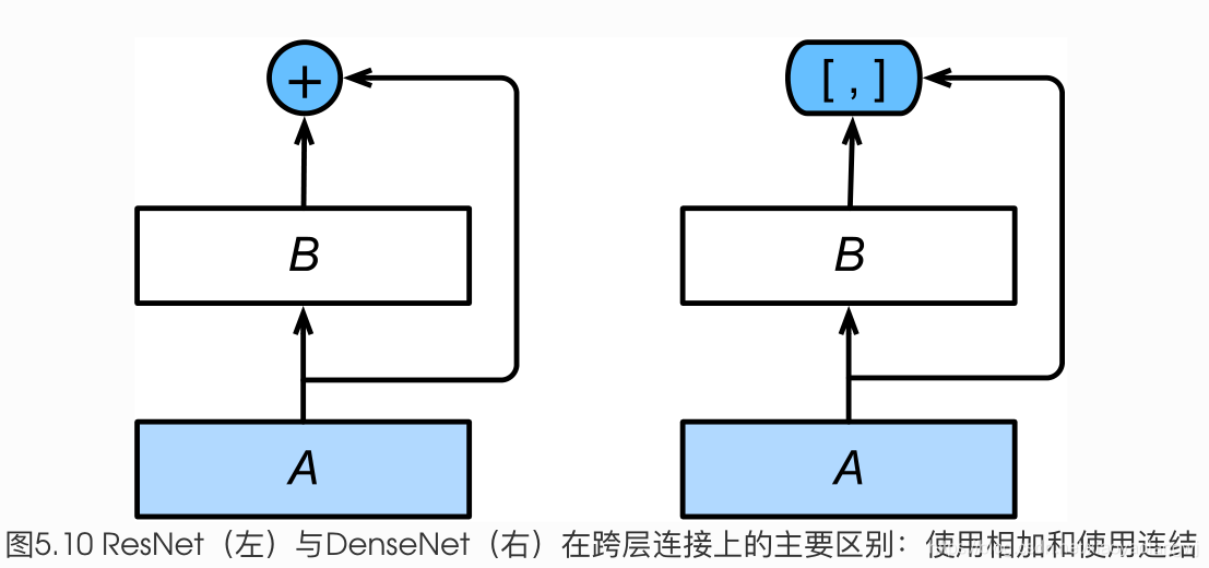 ResNet中的跨层连接设计引申出了数个后续工作。本节我们介绍其中的一个:稠密连接网络(DenseNet)。 它与ResNet的主要区别如图5.10所示。