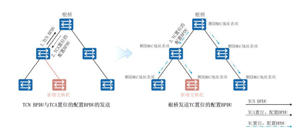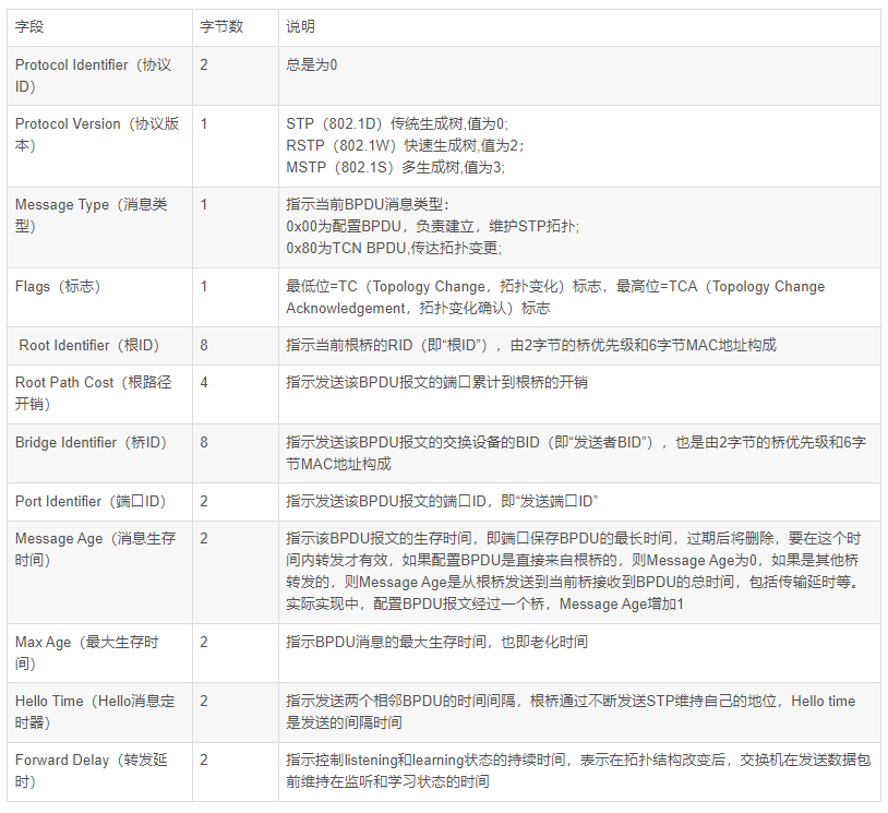 分为配置BPDU--config-BPDU(用于生成树的选举以及重收敛)和拓扑变更--TC-BPDU(通知交换网络出现了拓扑变更)。