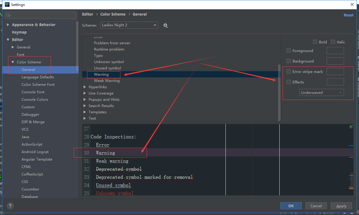 去除IDEA黄色警告波浪线File—>Setting—>Editor–>Color Scheme—>General版权声明:本文为gt18120588267原创文章,遵循CC 4.0 BY-SA版权协议,转载请附上原文出处链接和本声明。原文链接:https://blog.csdn.net/gt18120588267/article/details/106180548