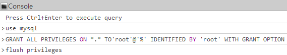 GRANT ALL PRIVILEGES ON *.* TO'root'@'%' IDENTIFIED BY 'root' WITH GRANT OPTION;