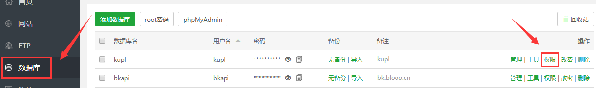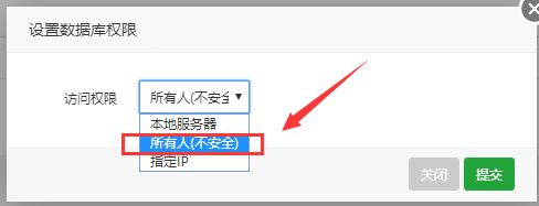 1.在宝塔面板找到你的数据库管理面板,找到你要远程访问的数据库选择权限管理=>选择所有人或(如果有独立IP可以选择指定IP访问)=>点击提交