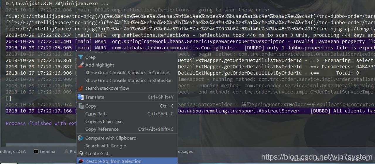 选中需要转换的mybatis log日志,然后点击右键,选择Restore sql from slection