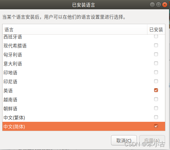 弹出“已安装语言”窗口,勾选中文(简体),点击应用