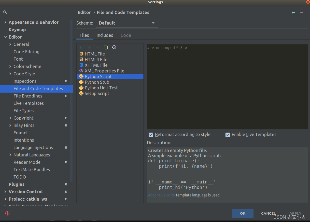 二、点击【File】---【Setting】---【Editor】---【File and Code Templates】,点击右边的【python script】,在编辑框中输入: #-*-coding:utf-8-*- ,保存设置之后,关闭pycharm.