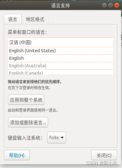 回到“语言支持”窗口,在键盘输入法系统中,选择“fcitx”