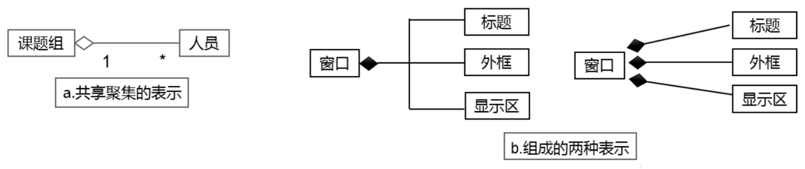 聚集可以进一步划分成共享聚集(Share Aggregation)和组成(Composition)。例如,课题组包含很多成员,而每个成员又可以是另一个课题组的成员,即部分可以参加多个整体,称为共享聚集。另外一 种情况是整体拥有各部分,部分与整体共存,如整体不存在了,部分也会消失,称为组成。