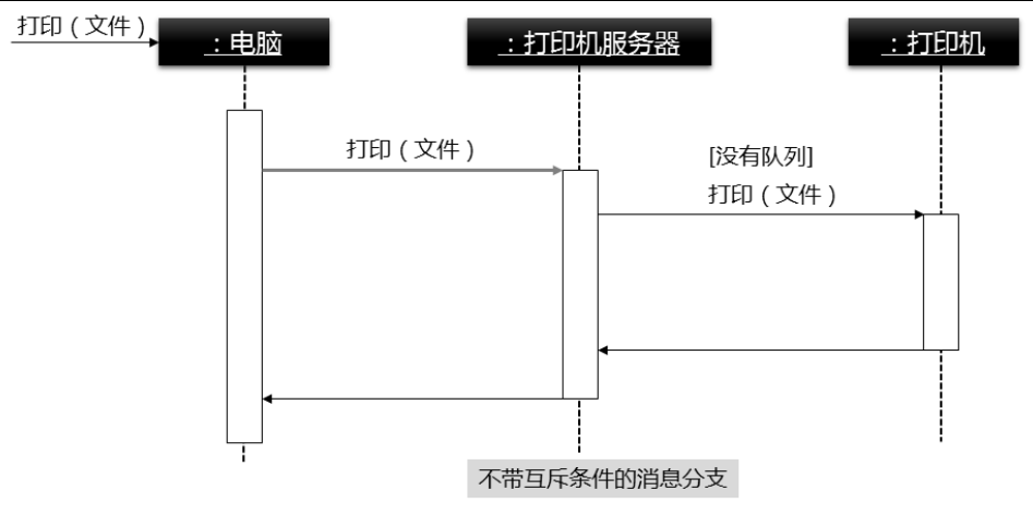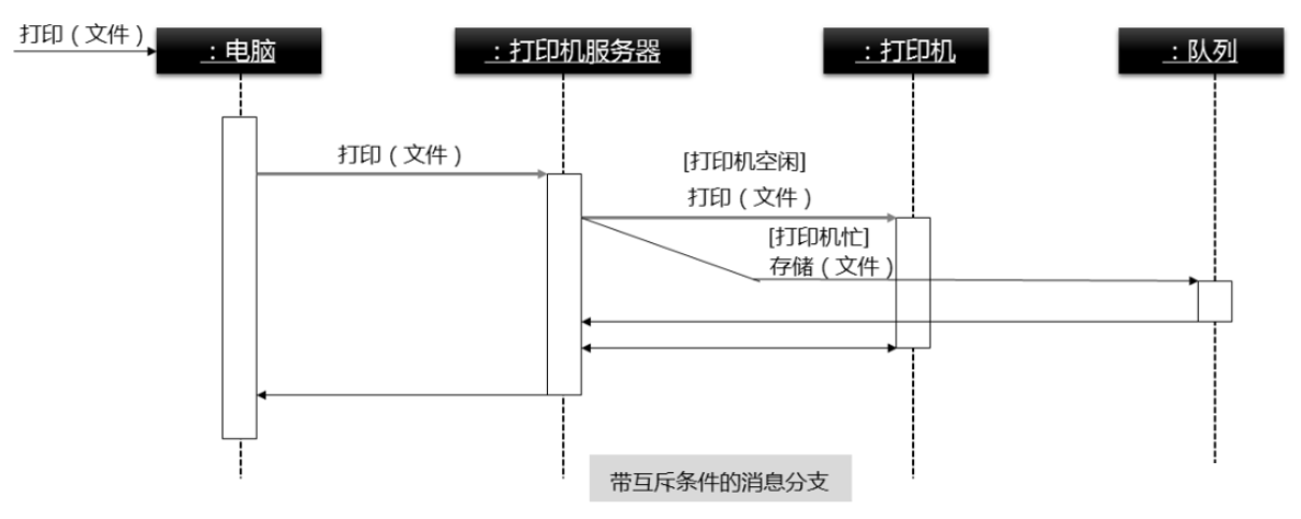 消息也可以附加条件,规定只有当条件为真时才可以发送和接收消息。当用条件来描述分支时,如果各分支的条件不互相排斥,则消息可能会并行发出。如下图所示是带互斥条件的消息分支。