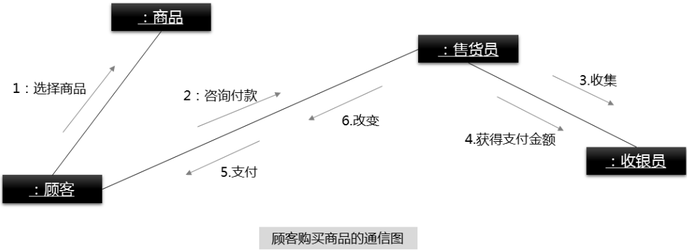 顺序图和通信图都描述交互,但是顺序图强调的是时间,而通信图强调的是空间。通信图中的主要元素基本和顺序图相同,只是在消息的传递上要特别表达消息的传递是由哪一个对象到另外一个对象。 通信图显示的是对象之间的关系,并不侧重交互的顺序,它没有将时间作为一个单独的维度,而是使用序列号来确定消息及并发线程的顺序。下图是顾客购买商品的通信图。