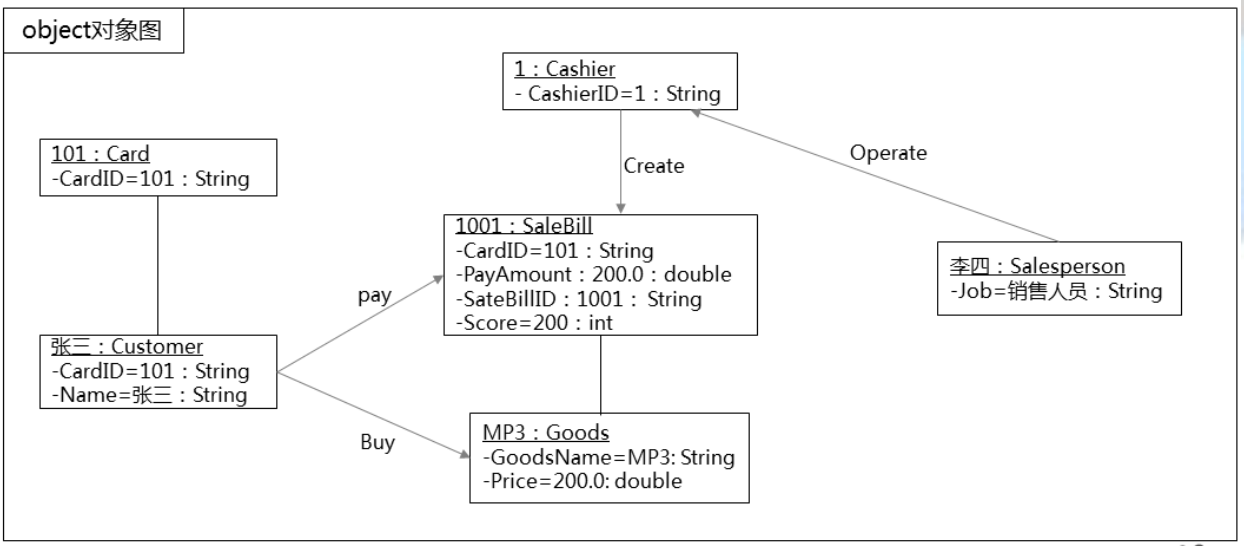 UML 中的对象图被用来描述特定时间点中所有对象在系统中的结构,也可以把对象图当成系统在某一时间点的“快照”。对象图是类图的一个实例,对象之间的关系是类之间的关系的实例,其图形表达与类的图形表示相似。对象图是某一个特定时间点上,系统所存在的所有对象的一个快照。如下图所示。
