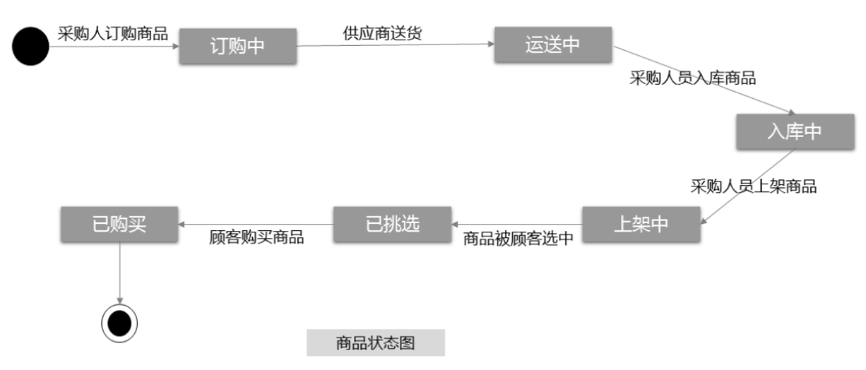 在状态图中,只能有一个起始状态,起始状态的图示是一个实心的圆形。结束状态代表整个状态机到此活动结束,可以有多个结束状态。状态与状态之间,是利用转移来表达其间的关系的,用带有箭头的直线图示。如果是因为某个事件发生而造成状态的转移,此时,需要在转移的关系上标示上该事件,如下图所示。
