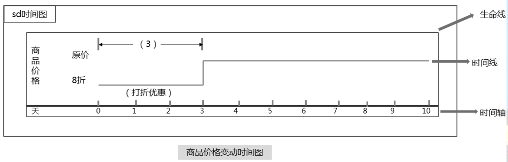 在时间图中,整个矩形框就是一个生命线(Life line),显示了商品价格在不同时间段的状态变化情况。状态可以用文字在内部进行描述,如原价状态。在矩形框的最下面为时间轴(TimelineRange),在时间轴上可以指定刻度单位,本例中是以天为单位。在矩形框内尚低起伏的线代表时间的进行以及状态的转移,称为时间线(Time line)。状态的转移主要是以事件来驱动,事件也以纯文字来表达,如下图所示。