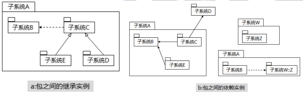 包能够引用来自其他包的模型元素。当一个包从另一个包中引用模型元素时,这两个包之间就建立了关系。包与包之间允许建立的关系有依赖、精化和通用化。