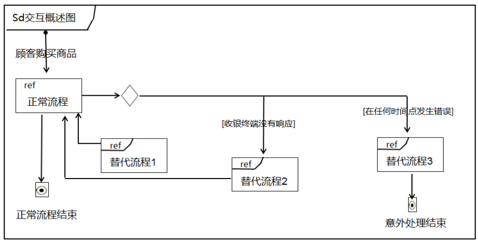 交互概述图可把不同的交互图结合在同一张图来表达。当系统中的对象协作关系越来越复杂,只用一张交互图无法表达时,可以使用交互概述图将所有交互图的关系呈现出来。