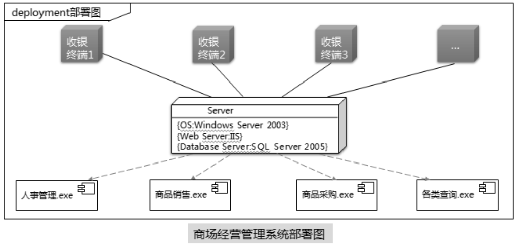 部署图又叫配置图,描述系统中硬件和软件的物理配置情况和系统体系结构。用结点表系实际的物理设备,并根据它们之间的连接关系,将相应的结点连接起来,并说明其连接方式。如下图所示。