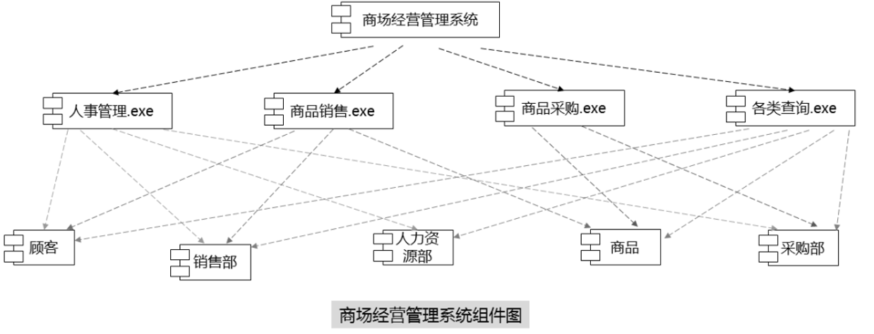 组件图用来表示系统的静态实现视图,展现了一组组件之间的组织和依赖,用于对源代码、可执行的发布、物理数据库等的系统建模。组件是逻辑设计中定义的概念和功能在物理架构中的实现。如下图所示。