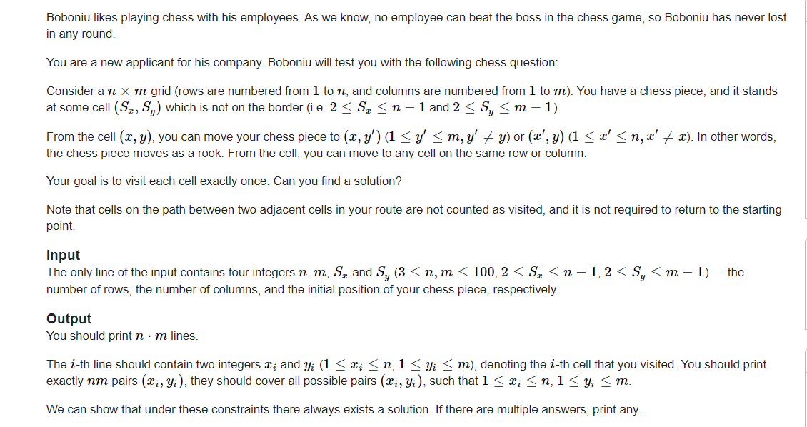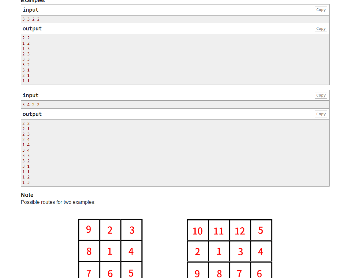 if(!d[x][y]) cout<<x<<" "<<y<<endl;