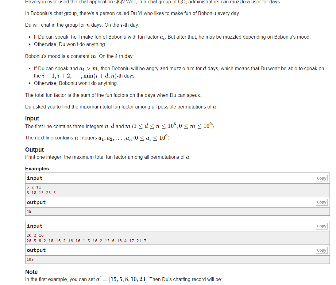 (眼瞎没看见序列可以重新排列) 贪心的思想为:先把大于m和小于等于m的区分开存放;假设当前有x个大于m的数,那么我们可以选择1~x个大于m的数,既然选了,肯定要选择最大的;假设我们选了y个,那么其中一个可以放在第n天,消耗1天;剩下的y-1个消耗 (y-1)*(d+1) ; 现在总共消耗 (y-1)*(d+1)+1天;剩下cnt = n-(y-1)*(d+1)+1天;这cnt天可以在小于m的数里面找,贪心找最大的前cnt个即可;