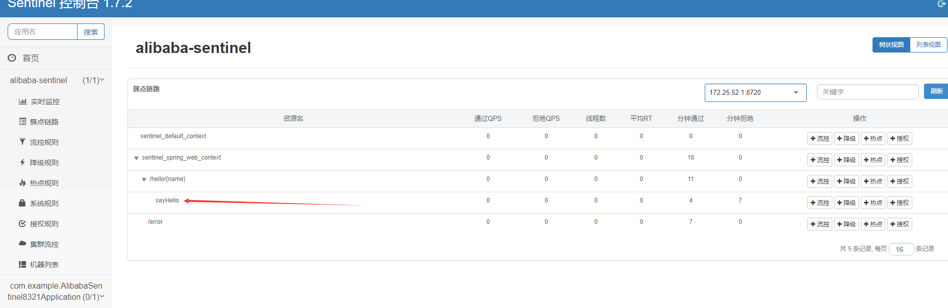 必须先访问一下:http://localhost:8321/hello/abc123,Sentinel中才会有监控项出现。