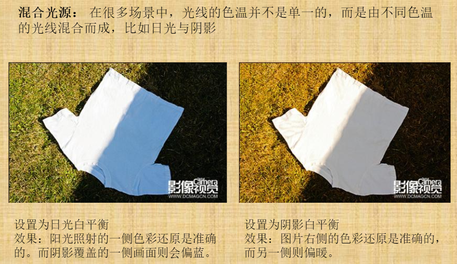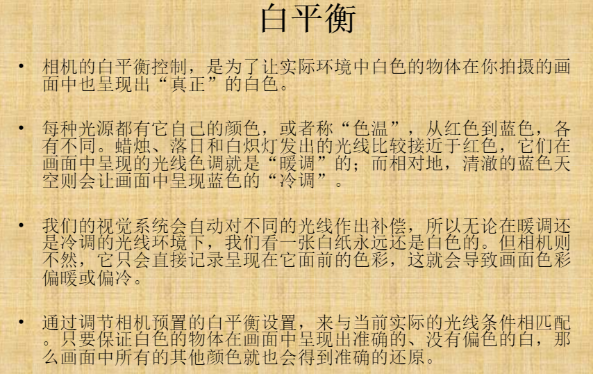 白平衡:只要保证白色的物体在画面中呈现出准确的,没有偏色的白,那么画面中所有的其他颜色就会得到准确的还原。