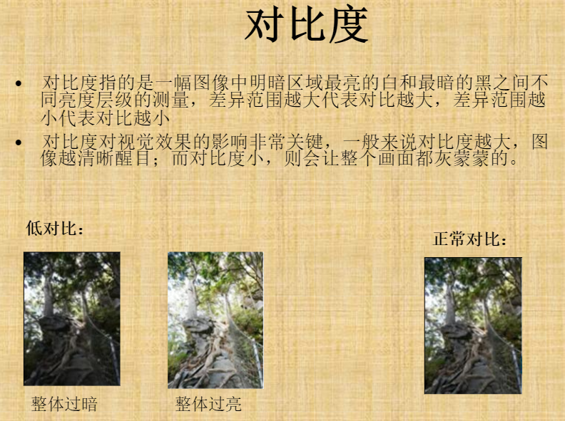 对比度越大,图像月清晰醒目,越小,就灰蒙蒙的。 对比度是一副图像中明暗区域最亮的白和最暗的黑之间不同亮度层级的测量。
