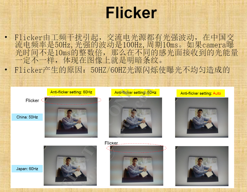 flicker是由工频率引起的,交流电光源都有光强波动,在中国交流电频是50Hz,光强波动100Hz, 周期10ms的整数倍。