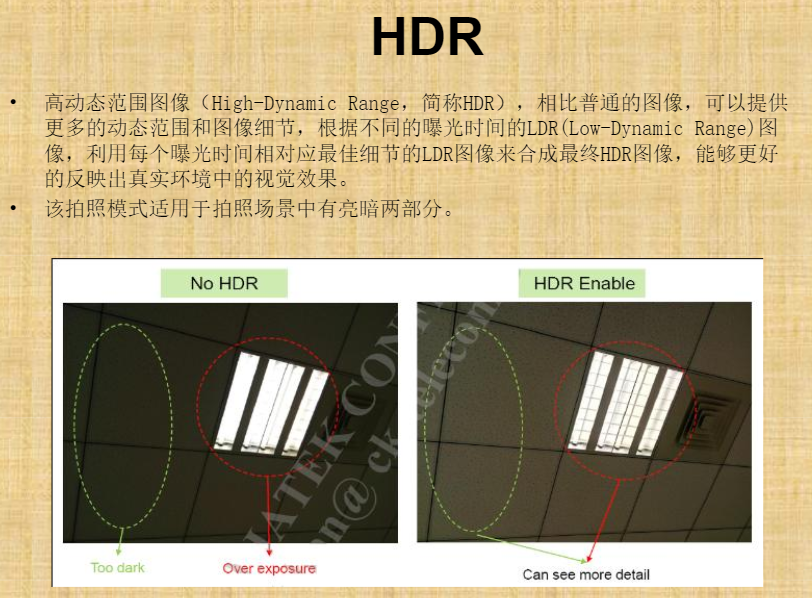 高动态范围图像: 根据不同的曝光时间的LDR图像,利用每个曝光时间相对应的最佳细节的LDR图像合成最终的HDR图像,能更好的反映出真实环境中的视觉效果。
