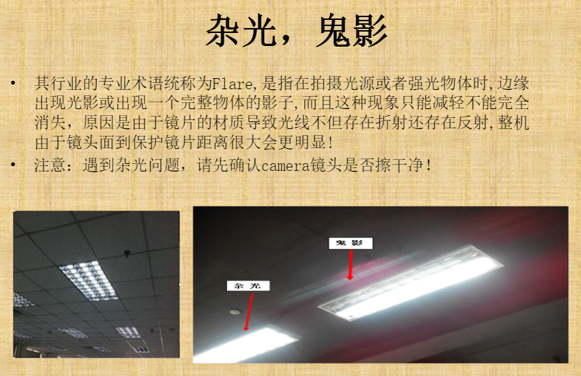 鬼影:是由于镜片的材质导致光线不但存在折射还存在反射, 整机由于镜头面到保护镜距离很大会很明显。