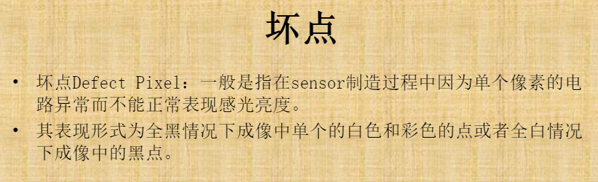 坏点: 单个像素的电路异常而不能正常表现感光亮度。 表现形式:在全黑的情况下,单个白色和彩色或者全白的情况下成像中的黑点。