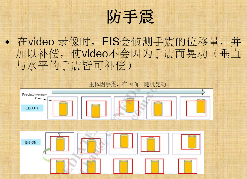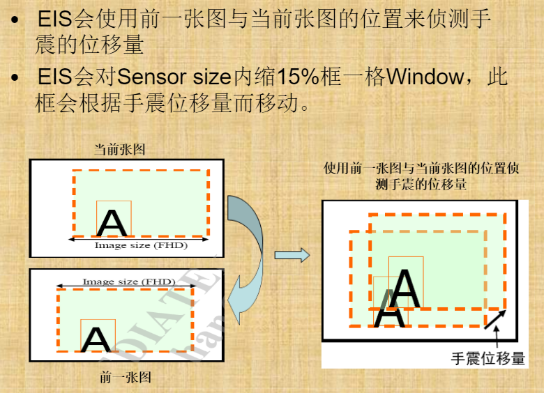 EIS: 会侦测手震度的位移量,并加以补偿。(主要是 使用前一张图和挡墙的图的位置来侦测手震的位移量)