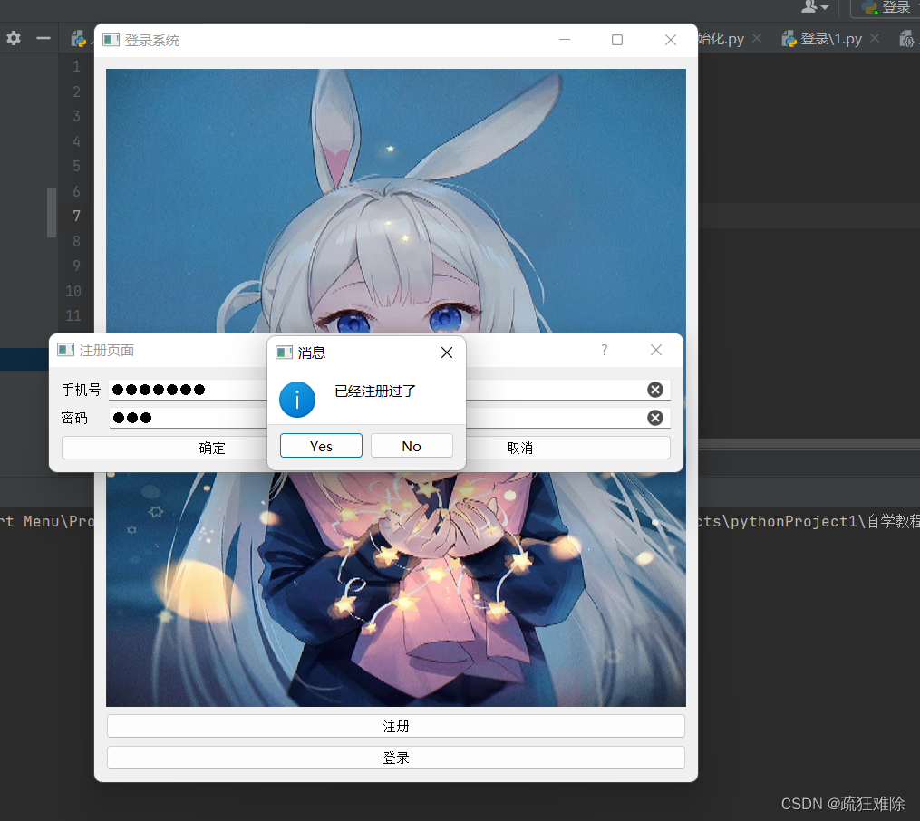 保存的时候,可以保存到数据库中,我一次保存想用json保存,会报错,不好解决。又不想打开数据库,就随便用个txt保存,意思意思一下,输入的手机号经过AES加密,密码使用的是MD5加密,32位小写加密。(使用第三方库hashlib和Crypto),没有可以pip一下。