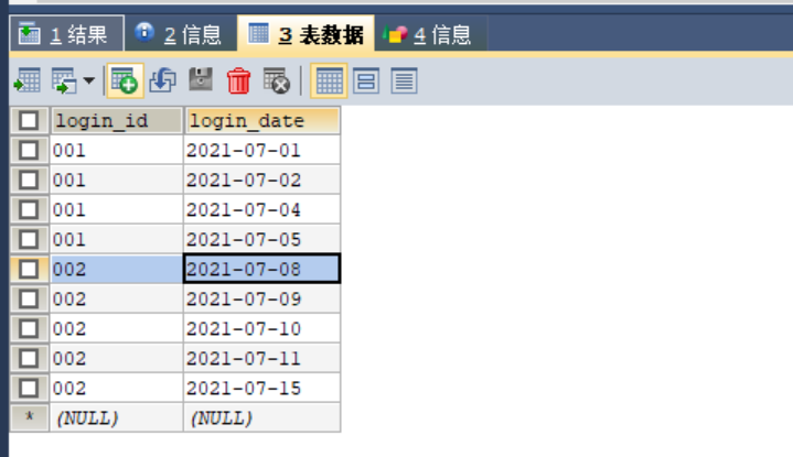insert into `login_t`(`login_id`,`login_date`) values ('001','2021-07-01'),('001','2021-07-02'),('001','2021-07-04'),('001','2021-07-05'),('002','2021-07-08'),('002','2021-07-09'),('002','2021-07-10'),('002','2021-07-11'),('002','2021-07-15');