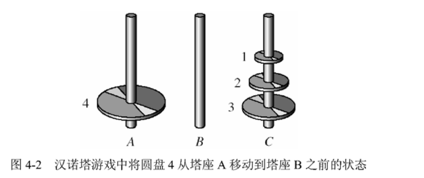 我们仍将分析,如何将前三个圆盘从A移动到C,然后圆盘4从A移动到B,前三个圆盘从C再移动到B.