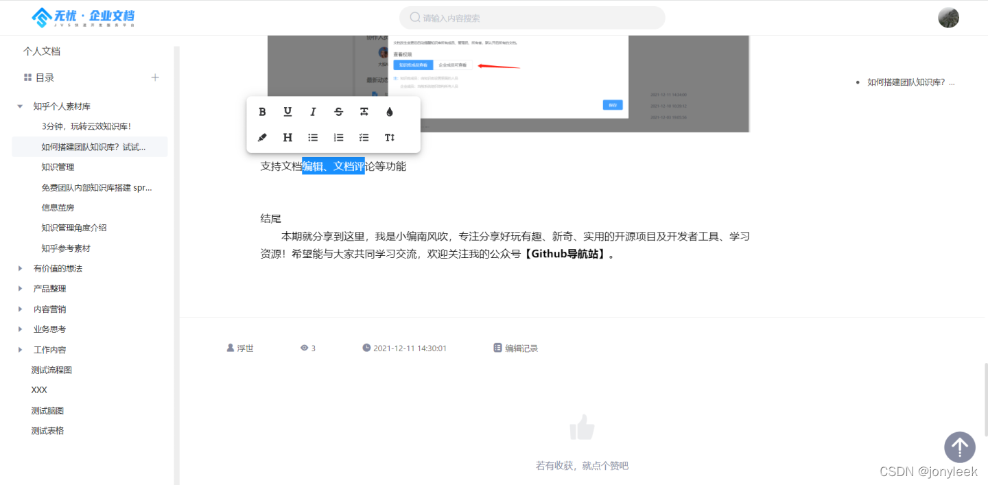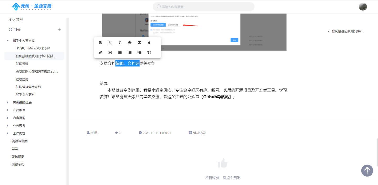 今天分享一个我常用的在线文档开源项目,这个项目主要用于企业内部私有化知识库、资料库、文档库、操作手册、个人博客、个人文档等企业内部内容管理平台,主要解决信息化的采集、信息的展现、信息的开发、信息共享等功能。