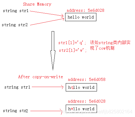 代码中str2用str1构造,此时两个对象共享同一块内存addr1。当执行str1[1]='q';时,string类的cow机制就体现出来了,在该过程中会copy一个副本给str1,地址为addr2,让其修改str1[1]='q';,修改后内存值为str2为"hqllo world"。但是str2内存地址仍然不变,地址中存的东西也不变。