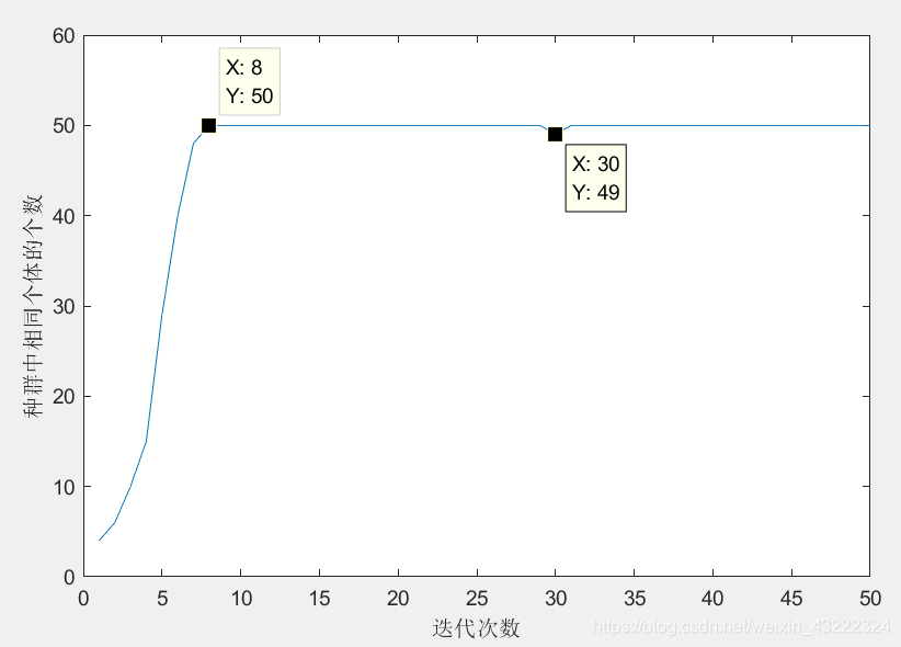 下图是种群中相同个体的数量随着迭代次数的变化曲线,可以看到,迭代到8次左右,算法收敛,种群中相同个体数量为50,也就是种群里所有个体都相同。