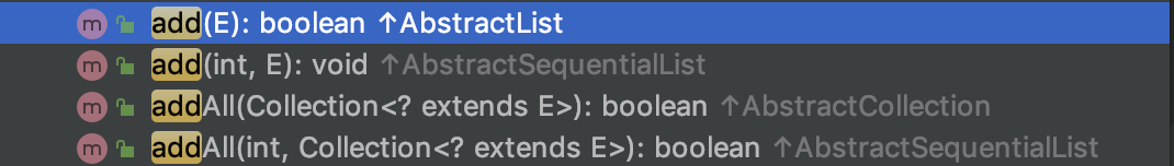 LinkedList实现了List接口,截图为List接口中定义的添加元素的方法,实现List接口表示具备线性表的能力【此文未提及迭代器中的add()方法】