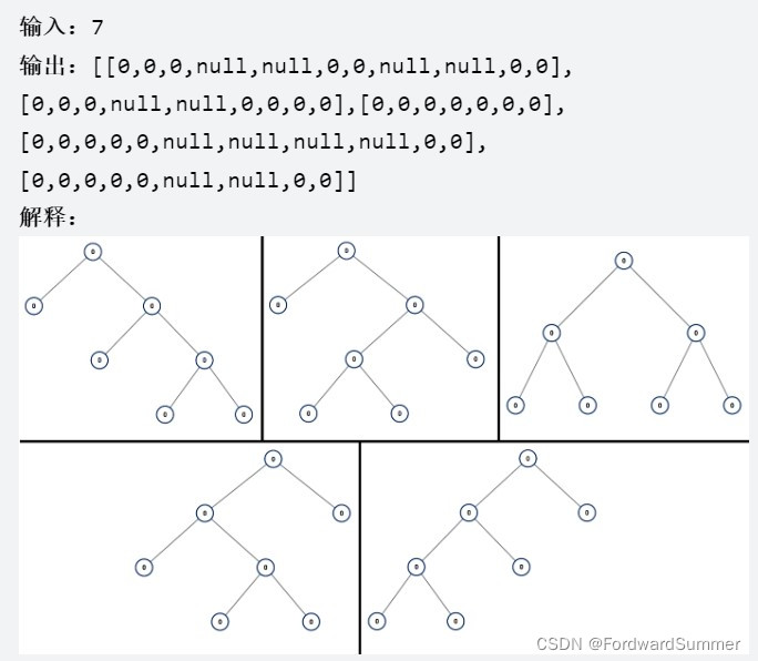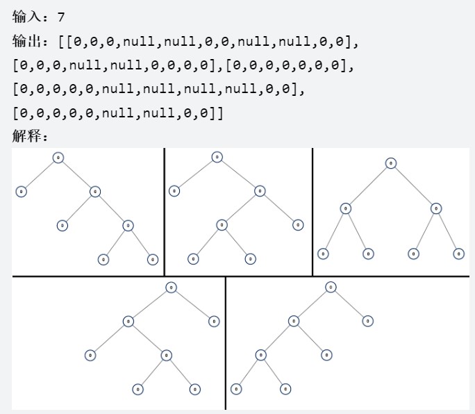 满二叉树是一类二叉树,其中每个结点恰好有 0 或 2 个子结点。返回包含 N 个结点的所有可能满二叉树的列表。 答案的每个元素都是一个可能树的根结点。答案中每个树的每个结点都必须有 node.val=0。你可以按任何顺序返回树的最终列表。