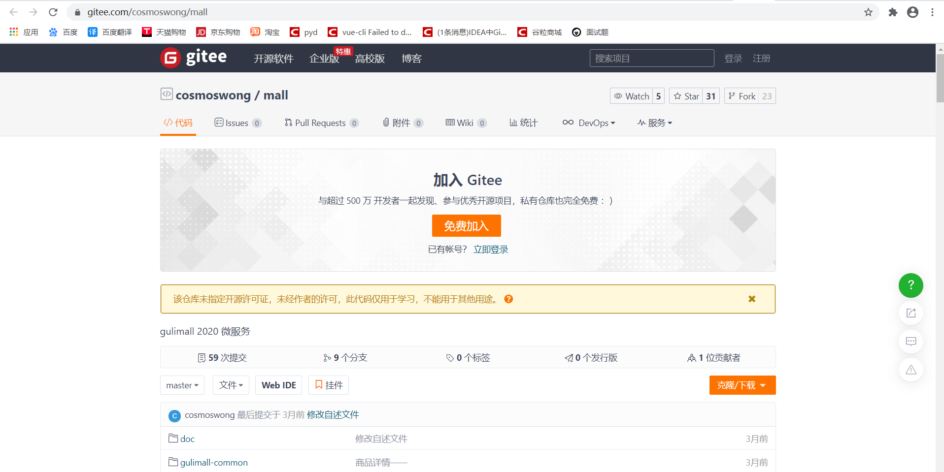 谷粒商城gitee代码https://gitee.com/cosmoswong/mall版权声明:本文为pyd1040201698原创文章,遵循CC 4.0 BY-SA版权协议,转载请附上原文出处链接和本声明。原文链接:https://blog.csdn.net/pyd1040201698/article/details/108189158