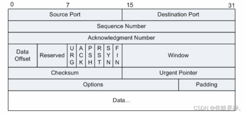 下来的数据偏移指的是首部长度,表示数据开始的地方离TCP段的起始处有多远。由于首部长度不固定,因此数据偏移字段是必要的。以32比特(4字节)为计算单位。最多有60字节的首部,若无选项字段,正常为20字节。Reserved,