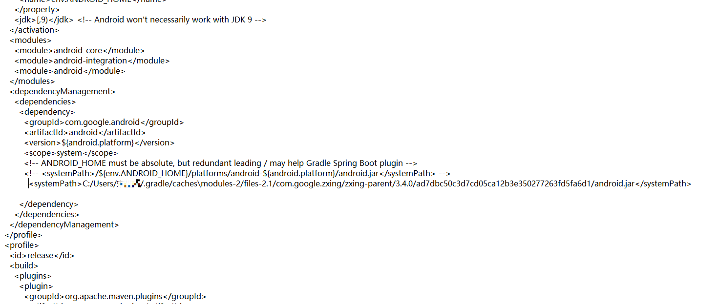 'dependencyManagement.dependencies.dependency.systemPath' for com.google.android:android:jar must specify an absolute path but is /${env.ANDROID_HOME}/platforms/android-22/android.jar in com.google.zxing:core:3.4.0