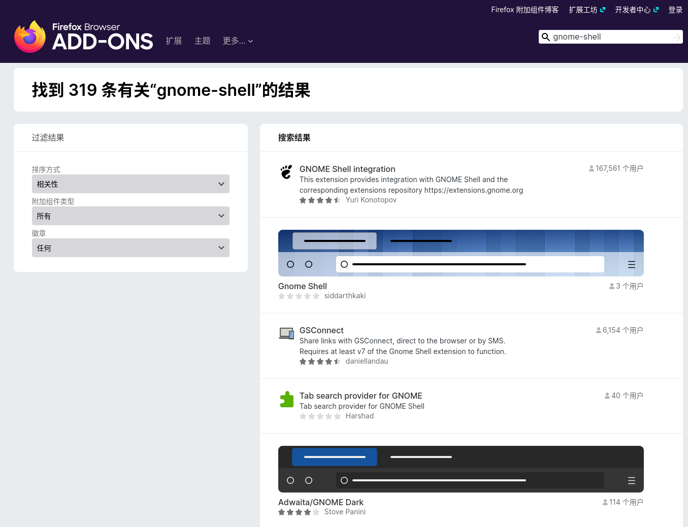 1、首先在火狐浏览器安装GNOME Shell integration插件,如图所示第一个就是。