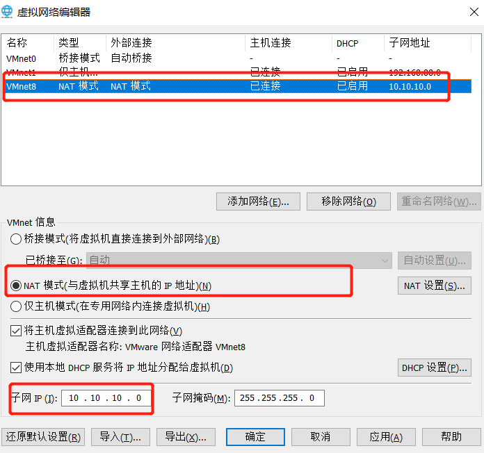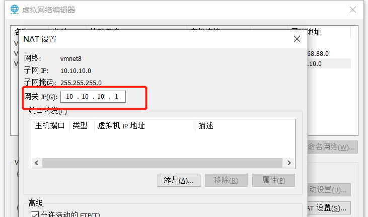 打开虚拟网络编辑器、选择VMnet8,然后点击右下角 更改设置后,修改子网IP和网关地址