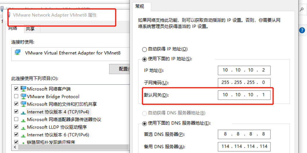 选择IPv4 修改默认网关和VMware中wmnet8中网关IP地址一直