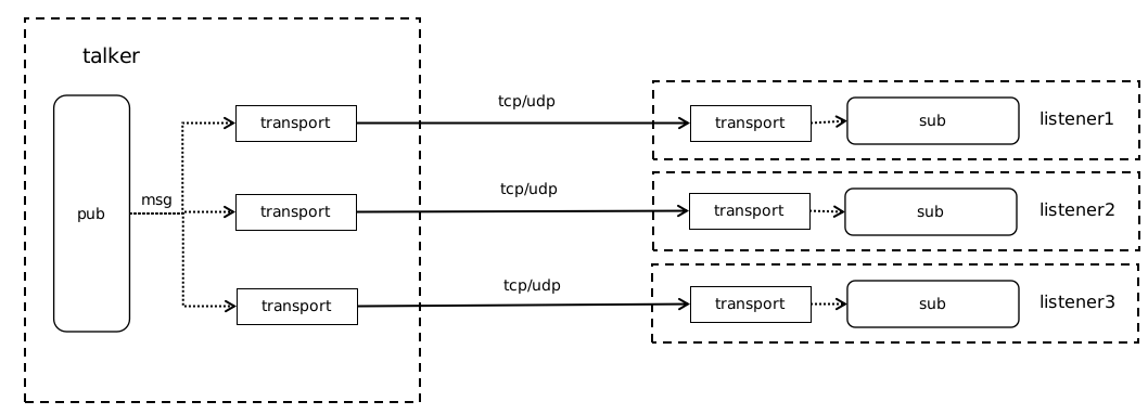 ros 底层通过 transport 实现talker和listener的通信。transport成对建立,为点对点通讯形式。当talker发布的一个topic被多个listener订阅时,ros会为每个listener都建立一个transport用于与其通信,当talker publish一个message时,ros通过遍历所有transport为每个listener发送message。