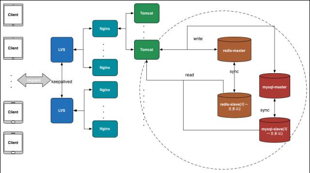 其中,虚线部分是数据库层,采用的是主从模式。也可以使用redis cluster(codis等)以及mysql cluster(Cobar等)来替换。