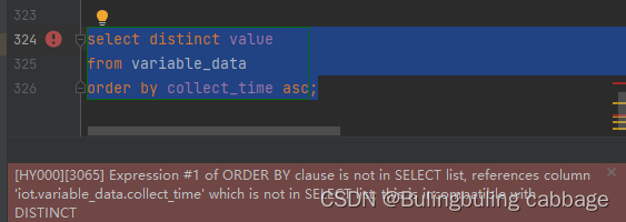 报错信息表明: ORDER BY子句的表达式#1不在SELECT列表中,引用列的数据库的变量数据中collect _time'字段不在SELECT列表中;这是不相容的