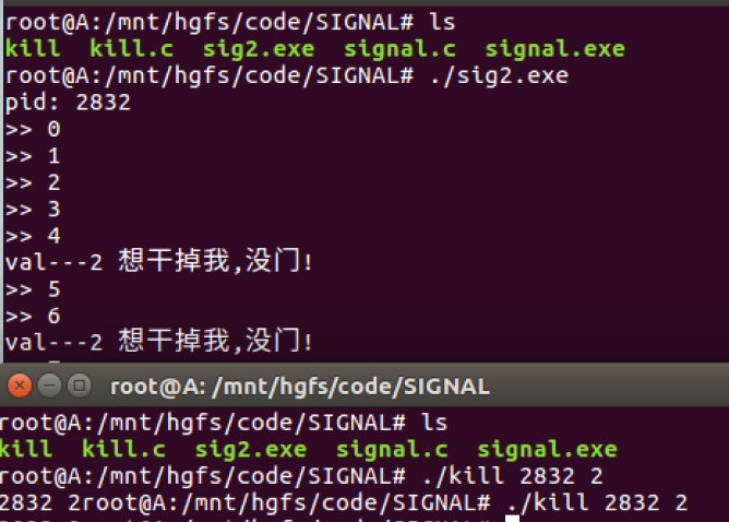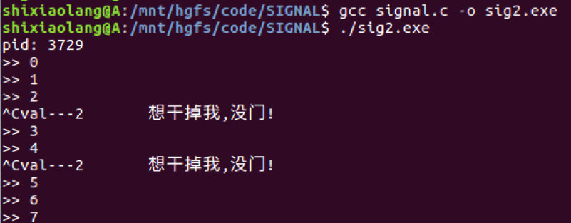 printf("val---%d\t想干掉我,没门!\n",val); //val 为 signum SIGINT的值为2